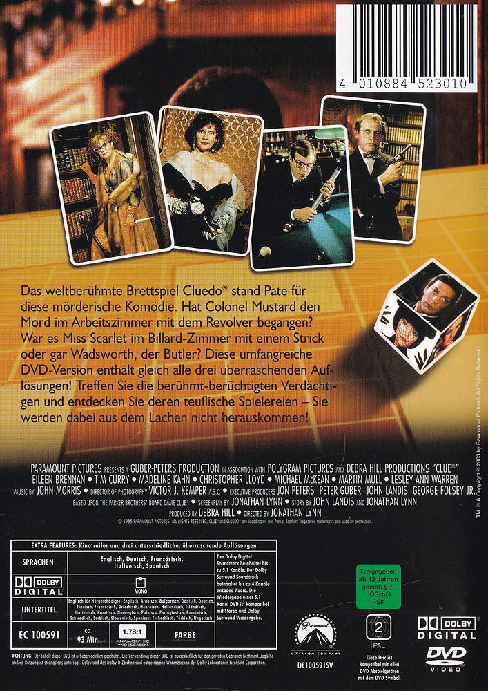 War es Miss Scarlet im Billard-Zimmer mit einem Strick oder gar Wadsworth, der Butler? Diese umfangreiche DVD-Version enthält gleich alle drei überraschenden Auflösungen! Treffen Sie die berühmt-berüchtigten Verdächtigen und entdecken Sie deren teuflische Spielereien - Sie werden dabei aus dem Lachen nicht herauskommen!