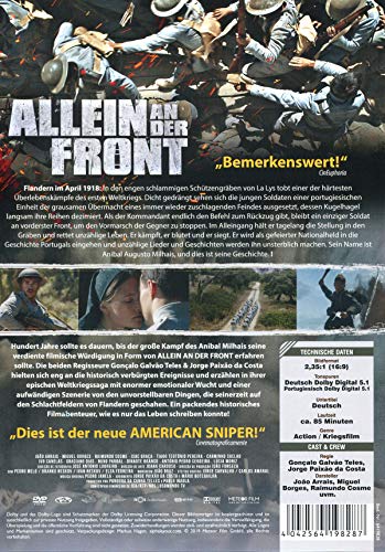 Flandern im April 1918: In den engen schlammigen Schützengräben von La Lys tobt einer der härtesten Überlebenskämpfe des ersten Weltkriegs. Dicht gedrängt sehen sich die jungen Soldaten einer portugiesischen Einheit der grausamen Übermacht eines immer wieder zuschlagenden Feindes ausgesetzt, dessen Kugelhagel langsam ihre Reihen dezimiert. Als der Kommandant endlich den Befehl zum Rückzug gibt, bleibt ein einziger Soldat an vorderster Front, um den Vormarsch der Gegner zu stoppen. Im Alleingang hält er tagelang die Stellung in den Gräben und rettet unzählige Leben. Er kämpft, er blutet und er siegt. Er wird als gefeierter Nationalheld in die Geschichte Portugals eingehen und unzählige Lieder und Geschichten werden ihn unsterblich machen. Sein Name ist Anibal Augusto Milhais, und dies ist seine Geschichte. Hundert Jahre sollte es dauern, bis der grosse Kampf des Anibal Milhais seine verdiente filmische Würdigung in Form von ALLEIN AN DER FRONT erfahren sollte. Die beiden Regisseure Gonçalo Galvão Teles & Jorge Paixão da Costa hielten sich eng an die historisch verbürgten Ereignisse und erzählen in ihrer epischen Weltkriegssaga mit enormer emotionaler Wucht und einer aufwändigen Szenerie von den unvorstellbaren Dingen, die seinerzeit auf den Schlachtfeldern von Flandern geschahen. Ein packendes historisches Filmabenteuer, wie es nur das Leben schreiben konnte!
