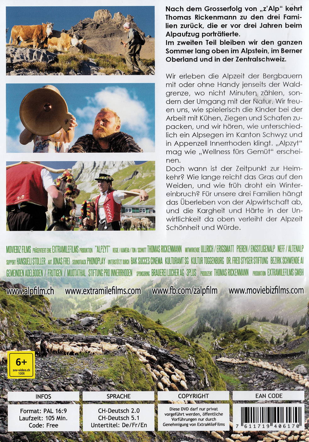 Wir erleben die Alpzeit der Bergbauern mit oder ohne Handy jenseits der Waldgrenze, wo nicht Minuten zählen, sondern der Umgang mit der Natur. "Alpzyt" mag wie "Wellness fürs Gemüt" erscheinen. Doch wann ist der Zeitpunkt zur Heimkehr? Wie lange reicht das Gras auf den Weiden, und wie früh droht ein Wintereinbruch? Für unsere drei Familien hängt das Überleben von der Alpwirtschaft ab, und die Kargheit und Härte in der Unwirtlichkeit da oben verleiht der Alpzeit Schönheit und Würde.