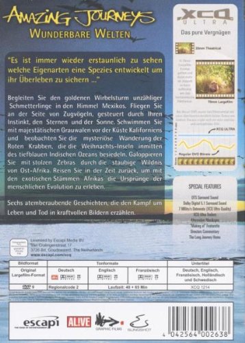 Begleiten Sie den goldenen Wirbelsturm unzähliger Schmetterlinge in den Himmel Mexikos. Fliegen Sie an der Seite von Zugvögeln, gesteuert durch Ihren Instinkt, den Sternen und der Sonne. Schwimmen Sie mit majestätischen Grauwalen vor der Küste Kaliforniens und beobachten Sie die mysteriöse Wanderung der Roten Krabben, die die Weihnachts-Inseln inmitten des tiefblauen Indischen Ozeans besiedeln. Galoppieren Sie mit stolzen Zebras durch die staubige Wildnis von Ost-Afrika. Reisen Sie in der Zeit zurück, um mit den exotischen Stämmen Afrikas die Ursprünge der menschlichen Evolution zu erleben. Sechs atemberaubende Geschichten, die den Kampf um Leben und Tod in kraftvollen Bildern erzählen.