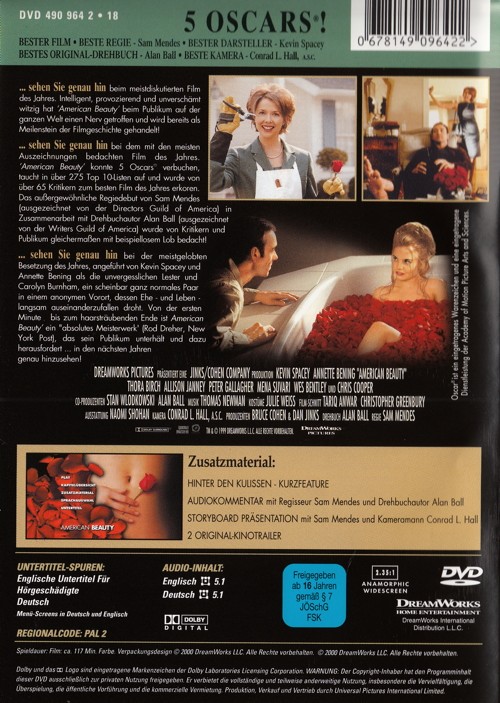 ....sehen Sie genau hin bei dem mit den miesten Auszeichnungen bedachten Film des Jahres. American Beauty konnte 5 Oscars verbuchen, taucht in über 275 Top 10-Listen auf und wurde von über 65 Kritikern zum besten Film des Jahres erkoren. Das aussergewöhnliche Regiedebut von Sam Mendes in Zusammenarbeit mit Drehbuchautor Alan Ball wurde von Kritikern und Publikum gleichermassen mit beispiellosem Lob bedacht!