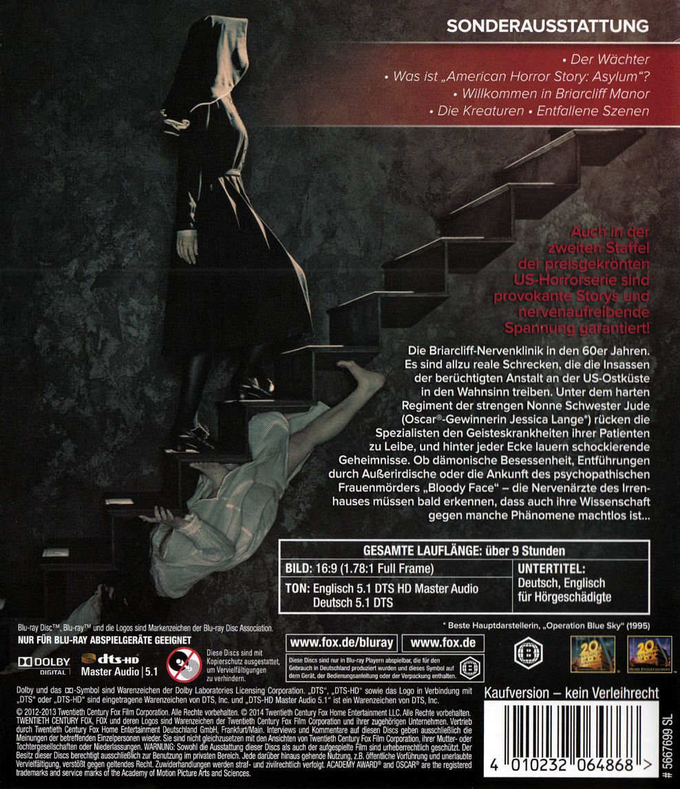 Auch in der zweiten Staffel der preisgekrönten US-Horrorserie sind provokante Storys und nervenaufreibende Spannung garantiert! Die Briarcliff-Nervenklinik in den 60er Jahren. Es sind allzu reale Schrecken, die die Insassen der berüchtigten Anstalt an der US-Ostküste in den Wahnsinn treiben. Unter dem harten Regiment der strengen Nonne Schwester Jude rücken die Spezialisten den Geisteskrankheiten ihrer Patienten zu Leibe, und hinter jeder Ecke lauern schockierende Geheimnisse. Ob dämonische Besessenheit, Entführungen durch Ausserirdische oder die Ankunft des psychopathischen Frauenmörders "Bloody Face" - die Nervenärzte des Irrenhauses müssen bald erkennen, dass auch ihre Wissenschaft gegen manche Phänomene machtlos ist...