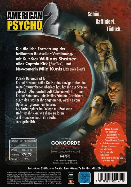 Patrick Bateman ist tot. Rachel Newman, das einzige Opfer, das seine Grausamkeiten überlebt hat, tritt nun sein unheilvolles Erbe an. Gezeichnet durch das, was Bateman ihr angetan hat, wird sie selbst vom Opfer zum Täter. Als Rachel dann im College auf Probleme stößt, ist ihr natürlich klar, wie diese zu lösen sind - und sie macht ihre Sache gründlich!