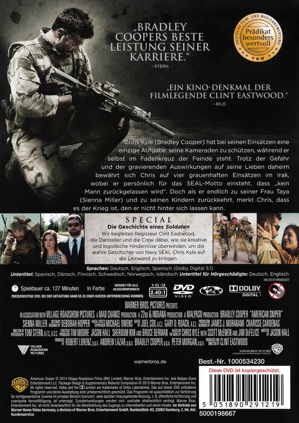U.S. Navy SEAL Chris Kyle hat bei seinem Einsatz im Irak eine einzige Aufgabe: seine Kameraden zu schützen. Seine überragende Treffsicherheit rettet auf dem Schlachtfeld unzähligen Soldaten das Leben, und als die Berichte seiner mutigen Taten die Runde machen, verdient er sich den Spitznamen "Legende". Doch auch auf der Seite des Feindes wird sein Name bekannt: Als ein Kopfgeld auf ihn ausgesetzt wird, gerät er ins Visier der Aufständischen. Einen ganz anderen Kampf muss er an der Heimatfront bestehen: Wie soll er sich als Ehemann und Vater bewähren, wenn die halbe Welt zwischen ihm und seiner Familie liegt?