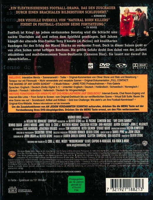 Oliver Stone und ein überaus energiegeladenes Darsteller-Ensemble zeichnen in diesem äusserst packenden Film das Schicksal eines kämpferischen Teams der amerikanischen Football-Liga NFL nach. Der altgediente Coach Tony D'Amato (Al Pacino) sieht sich Streitigkeiten im Team sowie einer neuen Besitzerin (Cameron Diaz), die ihn für viel zu altmodisch hält, gegenüber. Ein verletzter Quarterback (Dennis Quaid), ein extrovertierter, sturköpfiger Reserve-Quarterback (Jamie Foxx), ein schmieriger Teamarzt (James Woods) und ein Running Back mit einem mit Boni und Sonderregelungen gespickten Vertrag heizen die Stimming in "Stones elektrifizierendstem Film seit Jahren an. Ein umwerfendes Spektakel" (Peter Travers, Rolling Stone).