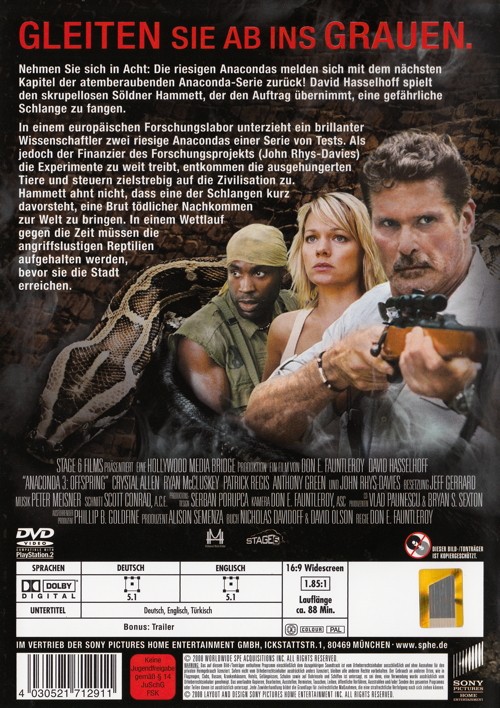 Nehmen Sie sich in Acht: Die riesigen Anacondas melden sich mit dem nächsten Kapitel der atemberaubenden Anaconda-Serie zurück! David Hasselhoff spielt den skrupellosen Söldner Hammett, der den Auftrag übernimmt, eine gefährliche Schlange zu fangen. In einem europäischen Forschungslabor unterzieht ein brillanter Wissenschaftler zwei riesige Anacondas einer Serie von Tests. Als jedoch der Finanzier des Forschungsprojekts die Experimente zu weit treibt, entkommen die ausgehungerten Tiere und steuern zielstrebig auf die Zivilisation zu. Hammett ahnt nicht, dass eine der Schlangen kurz davorsteht, eine Brut tödlicher Nachkommen zur Welt zu bringen. In einem Wettlauf gegen die Zeit müssen die angriffslustigen Reptilien aufgehalten werden, bevor sie die Stadt erreichen.