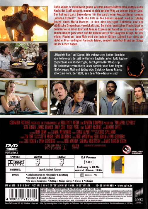 Dafür würde er meilenweit gehen: Als dem dauerbekifften Dale mitten in der Nacht der Stoff ausgeht, macht er sich auf den Weg zu seinem Dealer Saul. Der hat was ganz Besonderes für ihn parat: eine Neuzüchtung namens Ananas Express. Doch ehe Dale in den Genuss kommt, wird er zufällig Zeuge eines Mafia-Mordes, in den eine korrupte Polizistin und der städtische Drogenboss verwickelt sind. Bei seiner panischen Flucht lässt er dummerweise einen Joint mit Ananas Express am Tatort zurück, was ihn und seinen Dealer ganz oben auf die Abschussliste der Gangster bringt. Auf der wilden Flucht vor dem Mob wird den beiden Kiffern schnell klar, dass sie nicht an Gras-bedingter Paranoia leiden, sondern wahrlich Grund zur Sorge um ihr Leben haben...