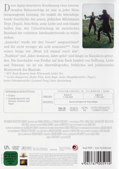Diese üppig inszenierte Filmfassung eines internationalen Bühnenerfolgs ist eine in jeder Weise herausragende Leistung. Sie erzählt die lebensbejahende Geschichte des armen, jüdischen Milchmanns Tevje (Topol). Sein Stolz, seine Liebe und sein Glaube helfen ihm, der Unterdrückung im zaristischen Russland der vorletzten Jahrhundertwende zu widerstehen.