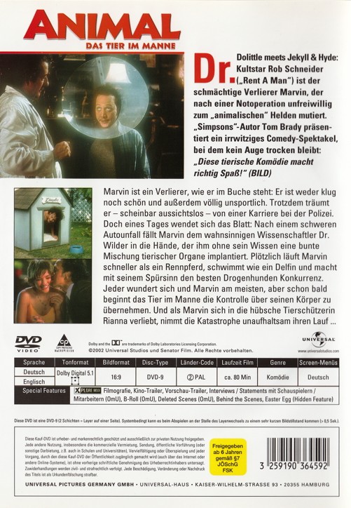 Marvin ist ein Verlierer, wie er im Buche steht: Er ist weder klug noch schön und ausserdem völlig unsportlich. Trotzdem träumt er - scheinbar aussichtslos - von einer Karriere bei der Polizei. Doch eines Tages wendet sich das Blatt: Nach einem schweren Autounfall fällt Marvin dem wahnsinnigen Wissenschaftler Dr. Wilder in die Hände, der ihm ohne sein Wissen eine bunte Mischung tierischer Organe implantiert. Plötzlich läuft Marvin schneller als ein Rennpferd, schwimmt wie ein Delfin und macht mit seinem Spürsinn den besten Drogenhund Konkurrenz. Jeder wundert sich und Marvin am meisten, aber schon bald beginnt das Tier im Manne die Kontrolle über seinen Körper zu übernehmen. Und als Marvin sich in die hübsche Tierschützerin Rianna verliebt, nimmt die Katastrophe unaufhaltsam ihren Lauf....