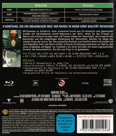 Willkommen in der Animatrix, der zukunftsweisenden Verbindung von Computer-Animation und japanischen Animés - inszeniert von den berühmtesten Animé-Regisseuren der Welt. Erleben Sie mit, wie die Matrix einst entstand, erfahren Sie mehr über die letzten Städte der Menschen, den Krieg gegen die Maschinen und den Untergang der Menschheit. Kommen Sie an Bord zum Letzten Flug der Osiris, der den explosiven Auftakt zum Kinofilm Matrix Reloaded und zum Videospiel Enter the Matrix bildet. Diese Kurzfilme liefern Ihnen Hintergrundwissen zur Matrix, das sonst nirgendwo verfügbar ist. Erweitern sie Ihren Horizont durch das überwältigend umfangreiche Bonus-Material: Die Zeit zum Plug-in ist gekommen.