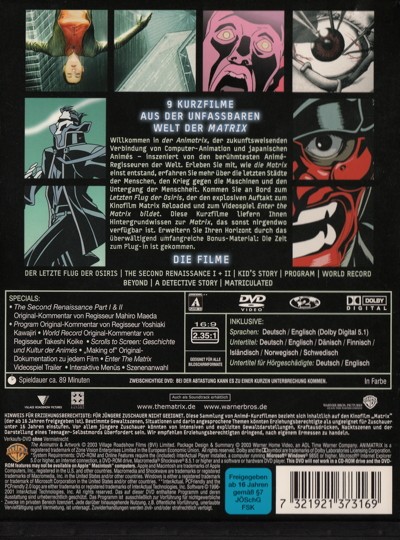 Willkommen in der Animatrix, der zukunftsweisenden Verbindung von Computer-Animation und japanischen Animés - inszeniert von den berühmtesten Animé-Regisseuren der Welt. Erleben Sie mit, wie die Matrix einst entstand, erfahren Sie mehr über die letzten Städte der Menschen, den Krieg gegen die Maschinen und den Untergang der Menschheit. Kommen Sie an Bord zum Letzten Flug der Osiris, der den explosiven Auftakt zum Kinofilm Matrix Reloaded und zum Videospiel Enter the Matrix bildet. Diese Kurzfilme liefern Ihnen Hintergrundwissen zur Matrix, das sonst nirgendwo verfügbar ist. Erweitern sie Ihren Horizont durch das überwältigend umfangreiche Bonus-Material: Die Zeit zum Plug-in ist gekommen.