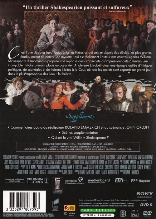 Shakespeare était-il un imposteur ? ANONYMOUS nous entraîne au beau milieu de l’Angleterre d’Elisabeth I, sur les traces d’un mystère qui a tenu en haleine pendant des siècles nombre d’académiciens et de brillants penseurs tels que Mark Twain ou Charles Dickens, Henry James ou encore Sigmund Freud : Qui est l’auteur des pièces signées par William Shakespeare?