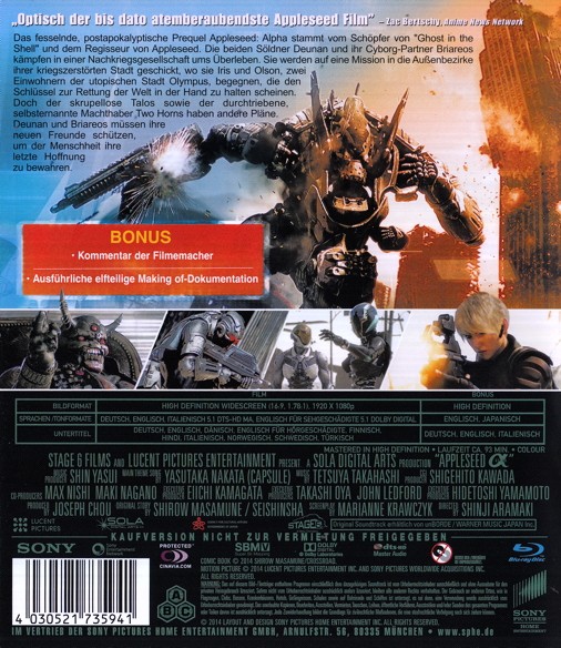 Das fesselnde, postapokalyptische Prequel Appleseed: Alpha stammt vom Schöpfer von Ghost in the Shell und dem Regisseur von Appleseed. Die beiden Söldner Deunan und ihr Cyborg-Partner Briareos kämpfen in einer Nachkriegsgesellschaft ums Überleben. Sie werden auf eine Mission in die Aussenbezirke ihrer kriegszerstörten Stadt geschickt, wo sie Iris und Olson, zwei Einwohnern der utopischen Stadt Olympus, begegnen, die den Schlüssel zur Rettung der Welt in der Hand zu halten scheinen. Doch der skrupellose Talos sowie der durchtriebene, selbsternannte Machthaber Two Horns haben andere Pläne. Deunan und Briareos müssen ihre neuen Freunde schützen, um der Menschheit ihre letzte Hoffnung zu bewahren.