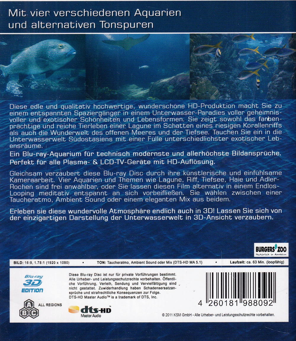 Es ist, als ob Sie mittendrin wären. Fische, wohin das Auge blicken kann. Es ist, als ob Sie nur die Hand ausstrecken bräuchten, um einen von Ihnen zu greifen. Diese 3D-Produktion entführt Sie in ein faszinierendes Salzwasser-Aquarium - halten Sie Ihre Handtücher bereit! Tauchen Sie ein in die mitreissende Unterwasserwelt mit all ihren geheimnisvollen und exotischen Schönheiten und Lebensformen! Machen Sie Urlaub zu Hause und geniessen trotzdem gleichzeitig einen Tauchgang im Meer. Die 3D-HD-Blu-ray Aquarium macht es möglich. Legen sie einfach diese wunderschöne Blu-ray-Produktion in Ihr 3D-Abspielgerät, setzen Sie Ihre 3D-Brille auf und schon geht die Reise los. Werden Sie zu einem entspannten Spaziergänger in einem wahren Unterwasser-Paradies. Ideal, um abzuschalten und gleichzeitig einmalig schöne Einblicke in die Wunderwelt des offenen Meeres und der Tiefsee zu gewinnen.