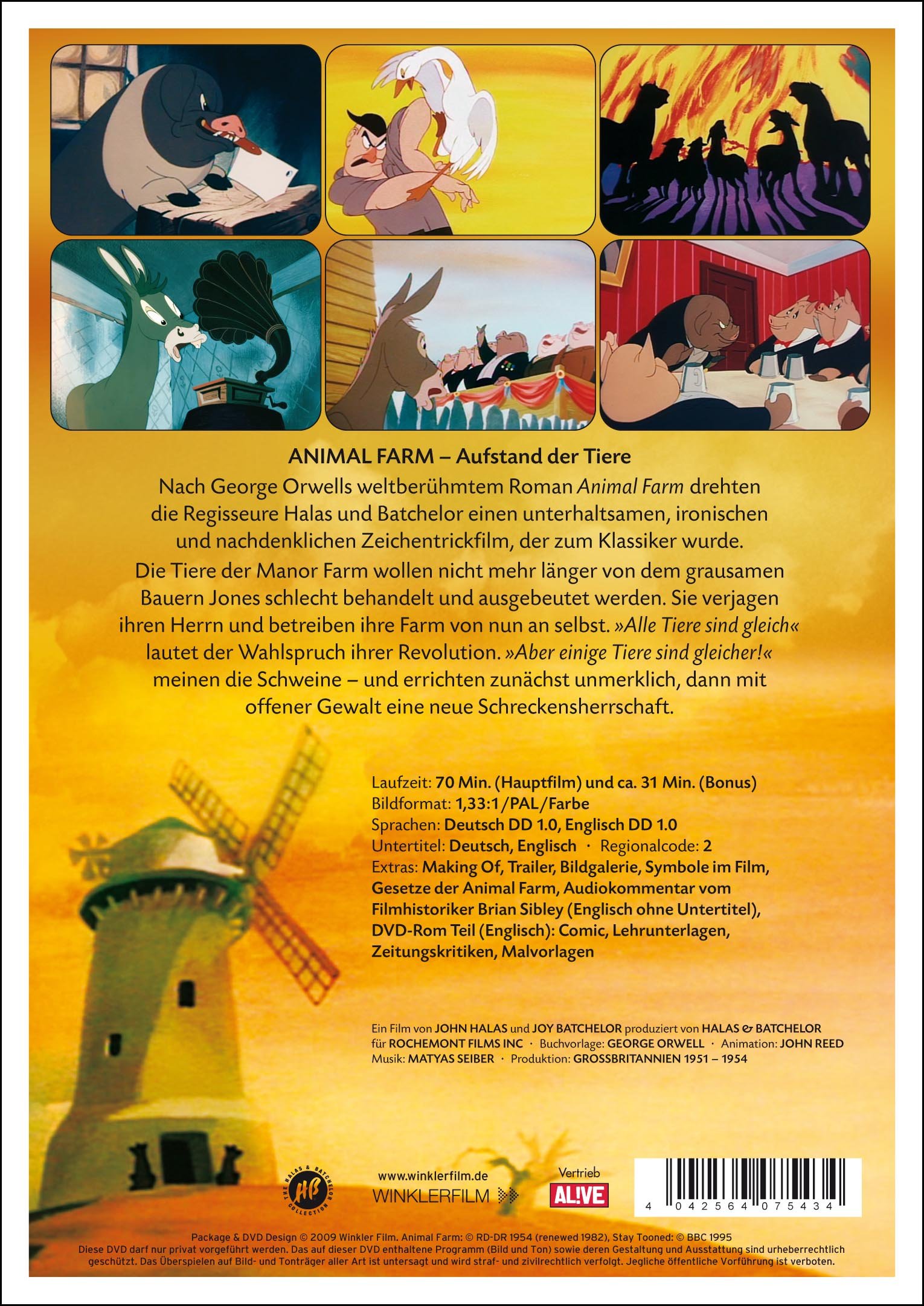 Bonusmaterial: Making Of; Trailer; Audiokommentar vom Filmhistoriker Brian Sibley (engl. ohne UT); Bildgalerie; Symbole im Film; Gesetze der Animal Farm; DVD-ROM-Teil (engl. ): Comic, Lehrunterlagen, Zeitungskritiken, Malvorlagen