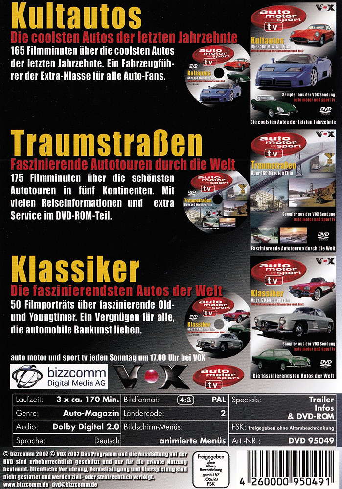 Multi-DVD-Pack mit kompakten Informationen und Kapiteln über die klassischen und kultige Autos der letzten 50 Jahre sowie die schönsten Routen in USA, Afrika, Südamerika, Kanada, Europa und China mit vielen Reisetipps.