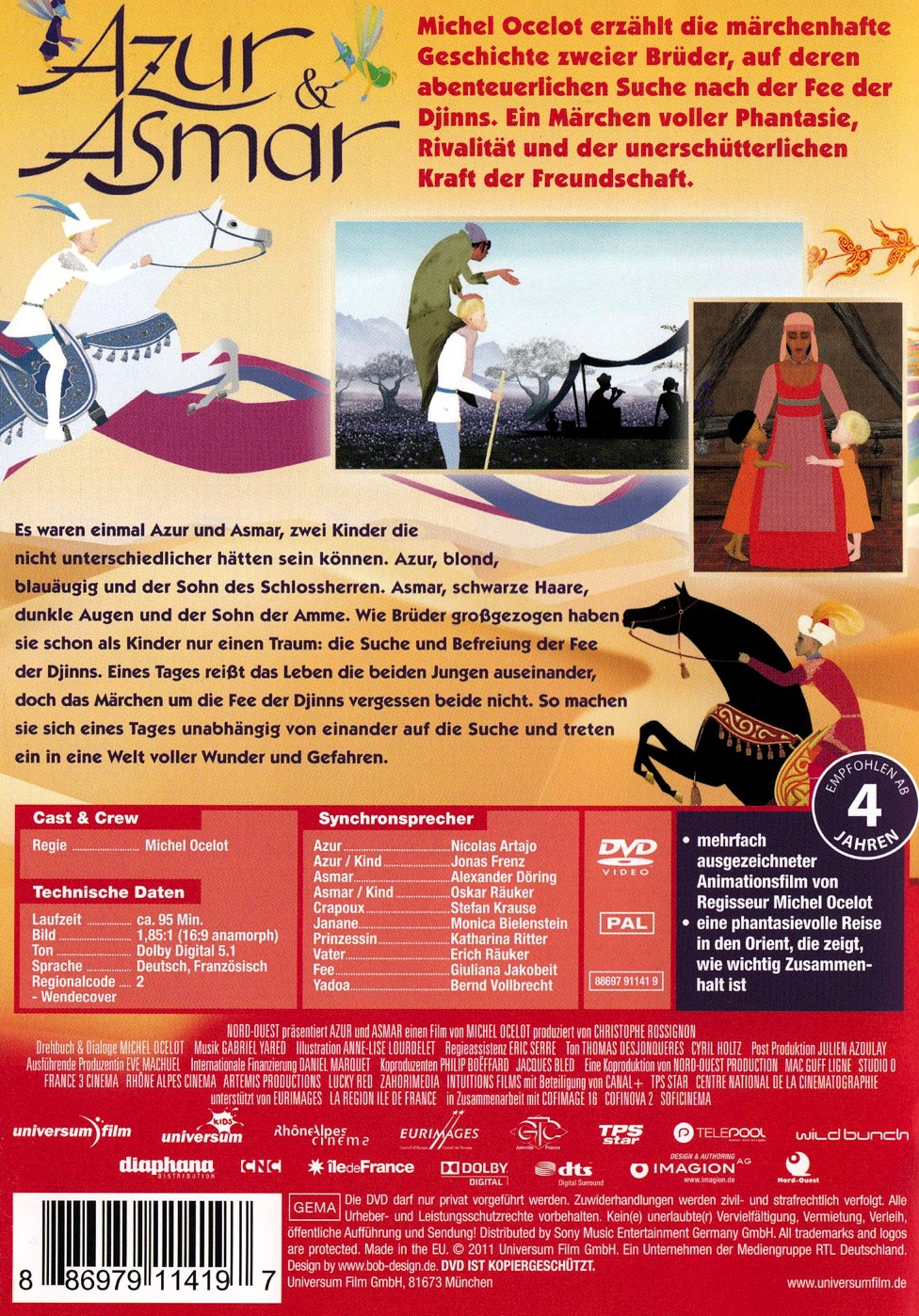 Es waren einmal Azur und Asmar, zwei Kinder die nicht unterschiedlicher hätten sein können. Azur, blond, blauäugig und der Sohn des Schlossherren. Asmar, schwarze Haare, dunkle Augen und der Sohn der Amme. Wie Brüder grossgezogen haben sie schon als Kinder nur einen Traum: die Suche und Befreiung der Fee der Djinns. Eines Tages reisst das Leben die beiden Jungen auseinander, doch das Märchen um die Fee der Djinns vergessen beide nicht. So machen sie sich eines Tages unabhängig voneinander auf die Suche und treten ein in eine Welt voller Wunder und Gefahren.