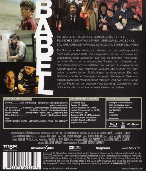 Ein Schuss in der Wüste von Marokko ist das auslösende Moment einer ganzen Kette von Ereignissen, die vier Schicksale von unterschiedlichen Menschen auf drei Kontinenten miteinander verbindet: Da ist ein amerikanischer Tourist, der in Marokko um das Leben seiner schwer verletzten Frau kämpft. Ein mexikanisches Kindermädchen, das verzweifelt versucht, die Grenze mit ihren beiden amerikanischen Schützlingen zu überqueren. Ein taubstummer japanischer Teenager, der gegen den eigenen Vater und dessen mysteriöse Vergangenheit rebelliert. Und zwei kleine Jungs auf der Flucht vor der eigenen Verantwortung. Geschichten und Schicksale, die nur scheinbar keine Verbindung haben...