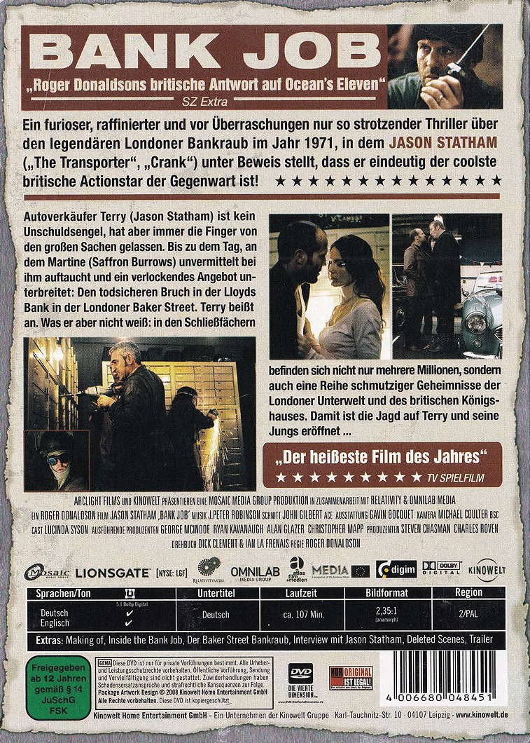 Autoverkäufer Terry (Jason Statham) ist kein Unschuldsengel, hab aber immer die Finger von den grossen Sachen gelassen. Bis zu dem Tag, an dem Martine (Saffron Burrows) unvermittelt bei ihm auftaucht und ein verlockendes Angebot unterbreitet: Den todsicheren Bruch der Lloyds Bank in der Londoner Baker Street. Terry beisst an. Was er nicht weiss: In den Schliessfächern befinden sich nicht nur mehrere Millionen, sondenr auch eine Reihe schmutziger Geheimnisse der Londoner Unterwelt und des britischen Königshauses. Damit ist die Jagd auf Terry und seine Jungs eröffnet...