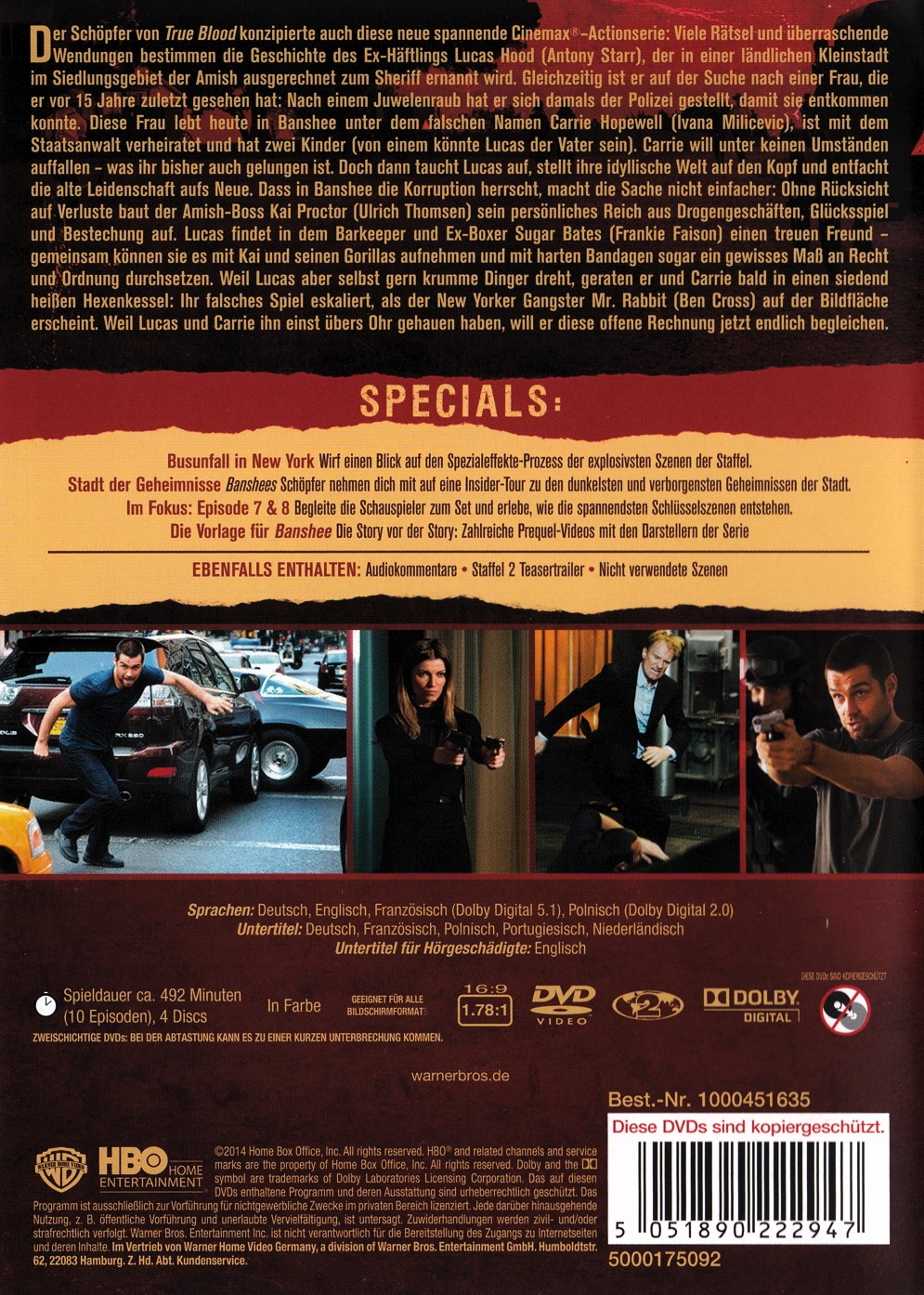 Der Schöpfer von True Blood konzipierte auch diese neue spannende Cinemax–Actionserie: Viele Rätsel und überraschende Wendungen bestimmen die Geschichte des Ex-Häftlings Lucas Hood (Antony Starr), der in einer ländlichen Kleinstadt im Siedlungsgebiet der Amish ausgerechnet zum Sheriff ernannt wird. Gleichzeitig ist er auf der Suche nach einer Frau, die er vor 15 Jahre zuletzt gesehen hat: Nach einem Juwelenraub hat er sich damals der Polizei gestellt, damit sie entkommen konnte. Diese Frau lebt heute in Banshee unter dem falschen Namen Carrie Hopewell (Ivana Milicevic), ist mit dem Staatsanwalt verheiratet und hat zwei Kinder (von einem könnte Lucas der Vater sein). Carrie will unter keinen Umständen auffallen – was ihr bisher auch gelungen ist. Doch dann taucht Lucas auf, stellt ihre idyllische Welt auf den Kopf und entfacht die alte Leidenschaft aufs Neue. Dass in Banshee die Korruption herrscht, macht die Sache nicht einfacher: Ohne Rücksicht auf Verluste baut der Amish-Boss Kai Proctor (Ulrich Thomsen) sein persönliches Reich aus Drogengeschäften, Glücksspiel und Bestechung auf. Lucas findet in dem Barkeeper und Ex-Boxer Sugar Bates (Frankie Faison) einen treuen Freund – gemeinsam können sie es mit Kai und seinen Gorillas aufnehmen und mit harten Bandagen sogar ein gewisses Maß an Recht und Ordnung durchsetzen. Weil Lucas aber selbst gern krumme Dinger dreht, geraten er und Carrie bald in einen siedend heißen Hexenkessel: Ihr falsches Spiel eskaliert, als der New Yorker Gangster Mr. Rabbit (Ben Cross) auf der Bildfläche erscheint. Weil Lucas und Carrie ihn einst übers Ohr gehauen haben, will er diese offene Rechnung jetzt endlich begleichen.