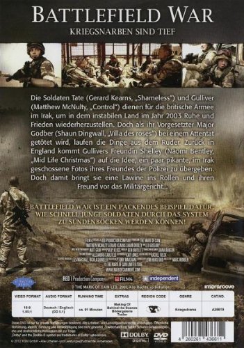Battlefield War - Kriegsnarben Sind TiefEin packender, actiongeladener Kriegsfilm mit hyperrealistischen Kampfsequenzen, die einem das Blut in den Adern gefrieren lassen…eine atemberaubende Mischung aus BLACK HAWK DOWN & THE HURT LOCKER. Extreme Materialschlachten, martialische Kampfszenen und spektakuläre CGI-Effekte. Dazu noch eine hervorragende, ergreifende Story. Handlung: Die Soldaten Tate (Gerard Kearns, SHAMELESS) und Gulliver (Matthew McNulty, CONTROL) dienen für die britische Armee im Irak, um in dem instabilen Land im Jahr 2003 Ruhe und Frieden wiederherzustellen. Doch als ihr Vorgesetzter Major Godber (Shaun Dingwall, VILLA DES ROSES) bei einem Attentat getötet wird, laufen die Dinge aus dem Ruder. Zurück in England kommt Gullivers Freundin Shelley (Naomi Bentley, MID LIFE CHRISTMAS) auf die Idee, ein paar pikante, im Irak geschossene Fotos ihres Freundes der Polizei zu übergeben. Doch damit bringt sie eine Lawine ins Rollen...