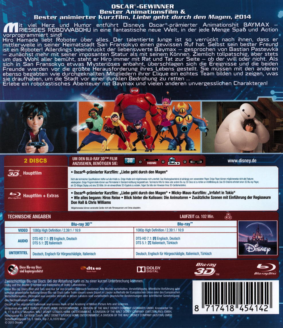 Hiro Hamada liebt Roboter über alles. Der technikbegeisterte Junge ist so verrückt nach ihnen, dass er als Experte in diesem Bereich in ganz San Fransokyo bekannt ist. Auch sein bester Freund ist ein Roboter - und wer glaubt, die hätten kein Herz, der kennt 'Baymax' noch nicht! Der sieht nicht nur aus wie ein Marshmallow, sondern ist auch mindestens genauso süss. Und auch wenn er zugegebenermassen ziemlich tollpatschig sein kann, steht er Hiro immer mit Rat und Tat zur Seite, ob der will oder nicht. Als sich in der Stadt etwas Mysteriöses anbahnt, werden die beiden vor grosse Herausforderungen gestellt. Zusammen mit ihren durchgeknallten Freunden, der Adrenalin-verrückten Gogo Tamago, Chemie-Ass Honey Lemon, Fanboy Fred und dem ordnungsliebenden Wasabi No-Ginger werden sie zu einer Gruppe von Hightech-Spezialisten, in deren Genie und Geschick das Schicksal von San Fransokyo liegt.