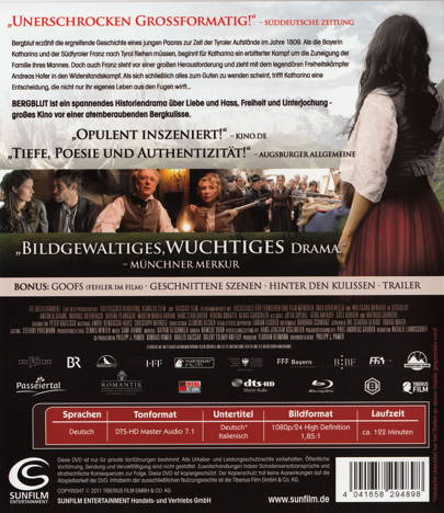 Bergblut erzählt die ergreifende Geschichte eines jungen Paares zur Zeit der Tyroler Aufstände im Jahre 1809. Als die Bayerin Katharina und der Südtyroler Franz nach Tyrol fliehen müssen, beginnt für Katharina ein erbitterter Kampf um die Zuneigung der Familie ihres Mannes. Doch auch Franz steht vor einer grossen Herausforderung und zieht mit dem legendären Freiheitskämpfer Andreas Hofer in den Widerstandskampf. Als sich schliesslich alles zum Guten zu wenden scheint, trifft Katharina eine Entscheidung die nicht nur ihr eigenes Leben aus den Fugen wirft...