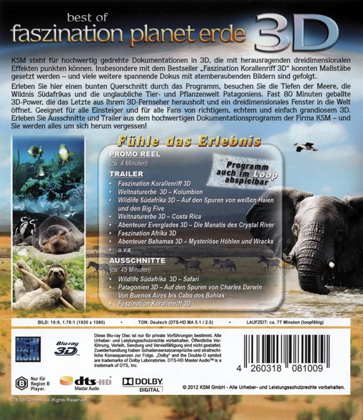 KSM steht für hochwertig gedrehte Dokumentationen in 3D, die mit herausragenden dreidimensionalen Effekten punkten können. Insbesondere mit dem Bestseller "Faszination Korallenriff 3D" konnten Massstäbe gesetzt werden - und viele weitere spannende Dokus mit atemberaubenden Bildern sind gefolgt. Erleben Sie hier einen bunten Querschnitt durch das Programm, besuchen Sie die Tiefen der Meere, die Wildnis Südafrikas und die unglaubliche Tier- und Pflanzenwelt Patagoniens. Fast 70 Minuten geballte 3D-Power, die das Letzte aus Ihrem 3D-Fernseher holt und ein dreidimensionales Fenster in die Welt öffnet. Geeignet für alle Einsteiger und für alle Fans von richtigem, echtem und einfach grandiosem 3D.