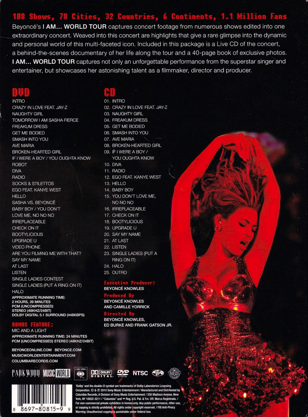 Beyoncé's I AM... WORLD TOUR captures concert footage from numerous shows edited into one extraordinary concert. Weaved into this concert are highlights that give a rare glimpse into the dynamic and personal world of this multi-faceted icon. Included in this package is a Live CD of the concert, a behind-the-scenes documentary of her life along the tour and a 40-page book of exclusive photos.