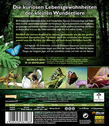 Das spektakuläre Real-3D-Ereignis mit fantastischen Aufnahmen! Sie gehören zu den erfolgreichsten Tieren auf unserem Planeten: 80 Prozent aller bekannten Arten sind Gliederfüßer. Sie sind unersättlich, höchst effizient, gut gepanzert und bestens organisiert. Aber erst aus der Nähe betrachtet zeigt sich die wahre Größe der kleinen Krabbler. Unter ihnen sind die größten Sonderlinge der Natur: Spinnen, die unter Falltüren lauern, Schmetterlinge, die Kontinente überqueren, Käfer, die einander vom Baum werfen oder gewiefte Konstrukteure von Treibsand-Fallen. Es sind die besten Flieger, die listigsten Jäger und die schnellsten Läufer auf mehr als vier Beinen. Faszinerende Real-3D-Aufnahmen, extreme Zeitlupen-Sequenzen und innovative Makro-Kameratechniken erlauben neue und fantastische Einblicke in das Leben von Spinnen, Schmetterlingen und Käfern.