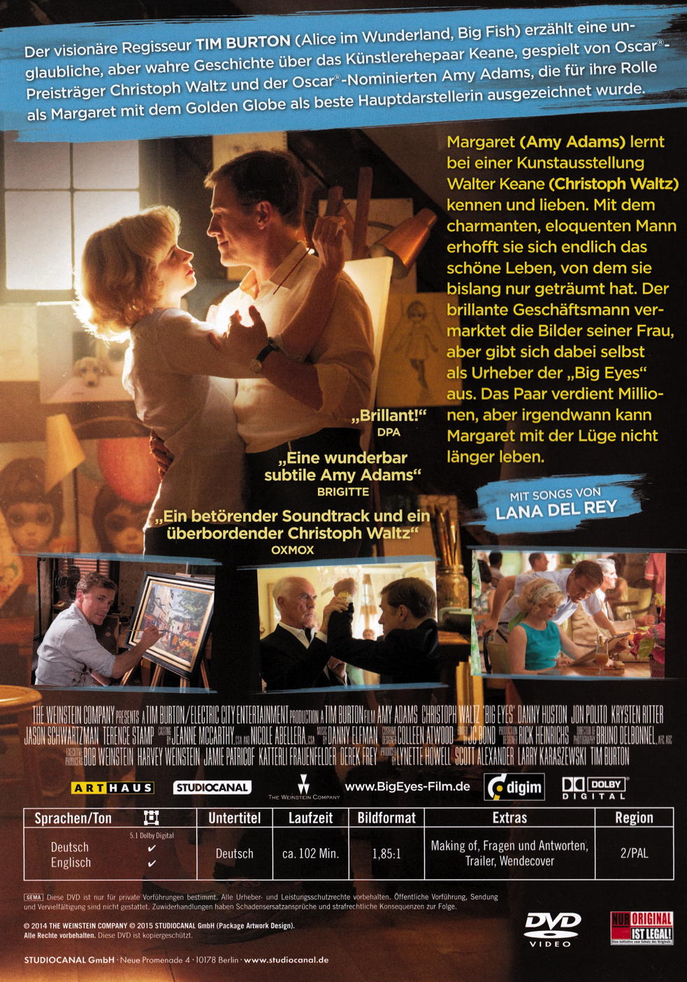 Tim Burton enthüllt das Bild eines faszinierenden Künstlerpaares und ihres aussergewöhnlichen Kunstbetrugs. Die Oscar-Nominierte Amy Adams erhielt für ihre Darstellung von Margaret Keane den Golden Globe. An der Seite von Oscar-Preisträger Christoph Waltz brilliert sie in diesem Drama zusammen mit Jason Schwartzman, Krysten Ritter, Terence Stamp, Danny Huston und Jon Polito in den Nebenrollen.