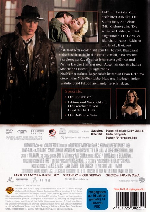 1947. Ein brutaler Mord erschüttert Amerika. Das Starlet Betty Ann Short alias "Die schwarze Dahlie", wird tot aufgefunden. Die Cops Lee Blanchard und Bucky Bleichert werden mit dem Fall betraut. Blanchard vertieft sich so tief in den Sensationsfall, dass er seine Beziehung zu Kay gefährdet und Partner Bleichert hat nur noch Augen für die rätselhaften Madeleine Linscott. Nach einer wahren Begebenheit inszeniert Brian De Palma diesen Film Noir über Liebe, Hass und Intrigen, indem Wahrheit und Fiktion ineinander verschmelzen.