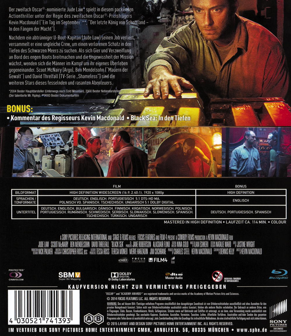 Tief unten in der schwarzen Kälte des Meeres, wo auf den Menschen eigentlich nichts als der Tod wartet, befindet sich die Besatzung eines U-Boots auf der Mission ihres Lebens: Im Abenteuer-Thriller Black Sea schickt der Oscar-prämierte Regisseur Kevin Macdonald die Zuschauer volle Kraft voraus Richtung einer nervenzerreissenden Tiefsee-Schatzjagd.