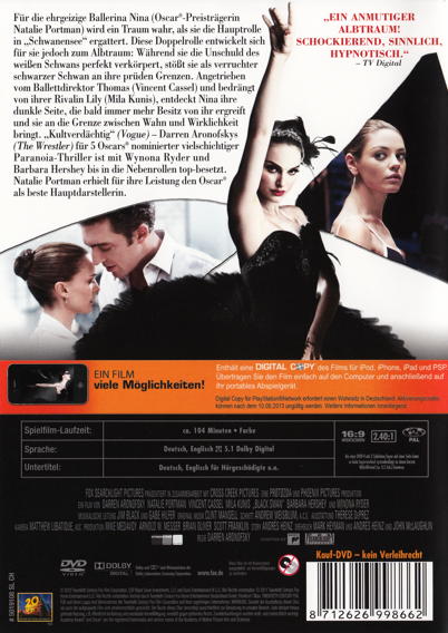 Für die ehrgeizige Ballerina Nina (Oscar-Preisträgerin Natalie Portman) wird ein Traum wahr, als sie die Hauptrolle in "Schwanensee" ergattert. Diese Doppelrolle entwickelt sich für sie jedoch zum Albtraum: Während sie die Unschuld des weissen Schwans perfekt verkörpert, stösst sie als verruchter schwarzer Schwan an ihre prüden Grenzen. Angetrieben vom Ballettdirektor Thomas (Vincent Cassel) und bedrängt von ihrer Rivalin Lily (Mila Kunis), entdeckt Nina ihre dunkle Seite, die bald immer mehr Besitz von ihr ergreift und sie an die Grenze zwischen Wahn und Wirklichkeit bringt.