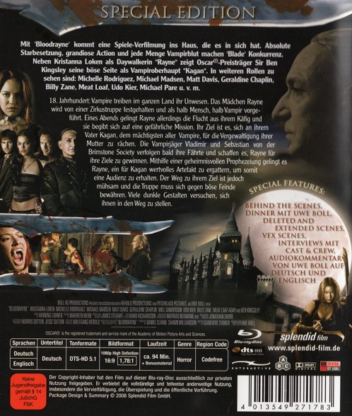 18. Jahrhundert: Vampire treiben im ganzen Land ihr Unwesen. Das Mädchen Rayne wird von einer Zirkustruppe festgehalten und als halb Mensch, halb Vampir vorgeführt. Eines Abends gelingt Rayne allerdings die Flucht aus ihrem Käfig und sie begibt sich auf eine gefährliche Mission. Ihr Ziel ist es, sich an ihrem Vater Kagan, dem mächtigsten aller Vampire, für die Vergewaltigung ihrer Mutter zu rächen. Die Vampirjäger Vladimir und Sebastian von der Brimstone Society verfolgen bald ihre Fährte und schaffen es, Rayne für ihre Ziele zu gewinnen. Mithilfe einer geheimnisvollen Prophezeiung gelingt es Rayne, ein für Kagan wertvolles Artefakt zu ergattern, um somit eine Audienz zu erhalten. Der Weg zu ihrem Ziel ist jedoch mühsam und die Truppe muss sich gegen böse Feinde bewähren. Viele dunkle Gestalten versuchen, sich ihnen in den Weg zu stellen.