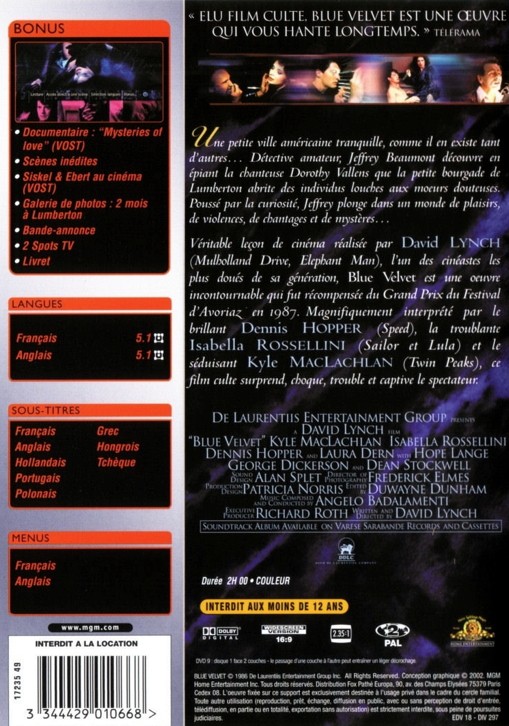 Une petite ville américaine tranquille, comme il en existe tant d'autres... Détective amateur, Jeffrey Beaumont découvre en épiant la chanteuse Dorothy Vallens que la petite bourgade de Lumberton abrite des individus louches aux moeurs douteuses. Poussé par la curiosité, Jeffrey plonge dans un monde de plaisirs, de violences, de chantages et de mystères...
