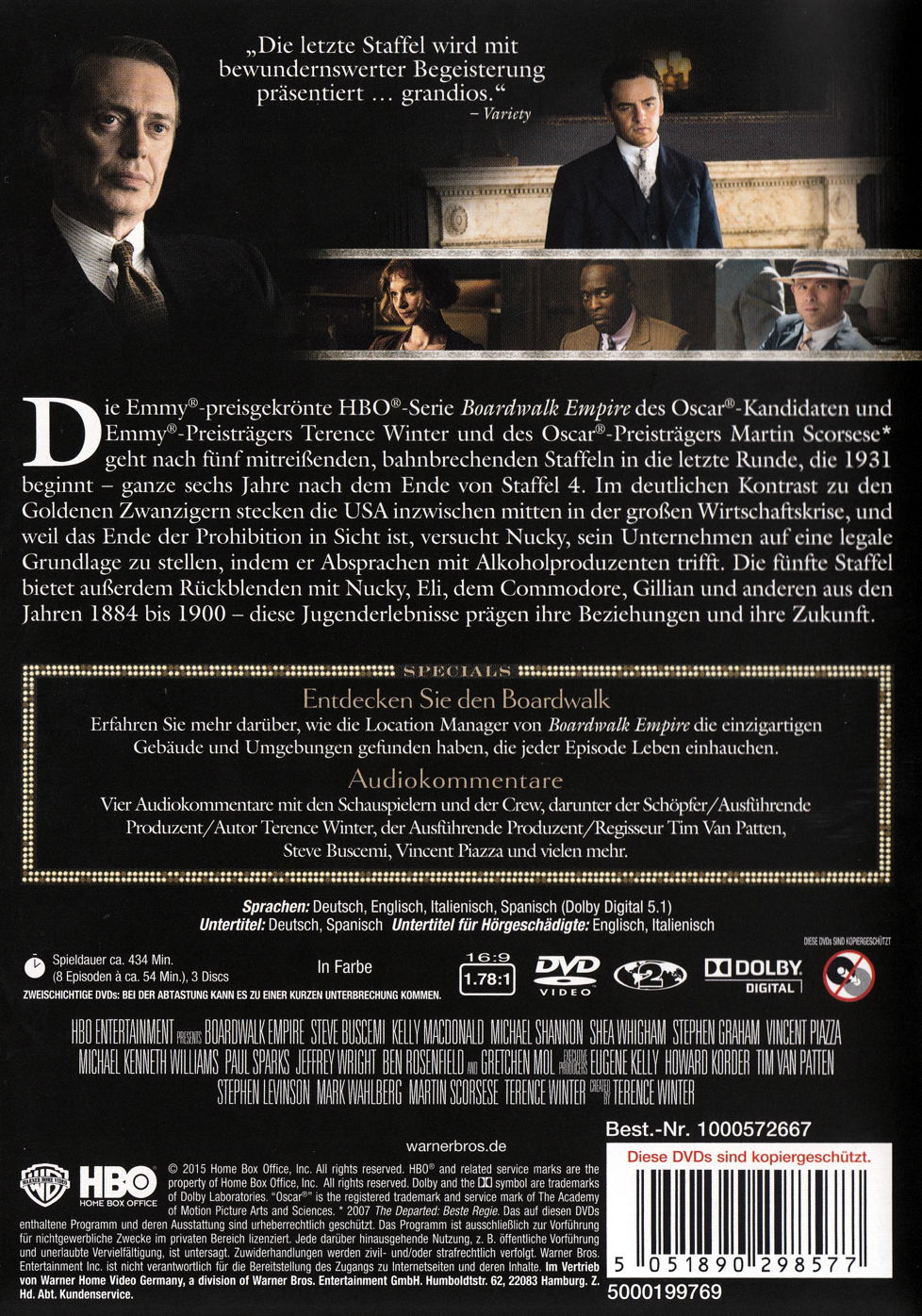 Die Emmy-preisgekrönte HBO-Serie Boardwalk Empire des Oscar-Kandidaten/Emmy-Preisträgers Terence Winter und des Oscar-Preisträgers Martin Scorsese geht nach fünf mitreissenden, bahnbrechende Staffeln in die letzte Runde, die 1931 beginnt - ganze sechs Jahre nach dem Ende von Staffel 4. Im deutlichen Kontrast zu den Goldenen 20er-Jahren stecken die USA inzwischen mitten in der grossen Wirtschaftskrise, und weil das Ende der Prohibition in Sicht ist, versucht Nucky sein Unternehmen auf eine legale Grundlage zu stellen, indem er Absprachen mit Alkoholproduzenten trifft. Die fünfte Staffel bietet ausserdem Rückblenden mit Nucky, Eli, dem Commodore, Gillian und anderen aus den Jahren 1884-1900 - diese Jugenderlebnisse prägen ihre Beziehungen und ihre Zukunft.