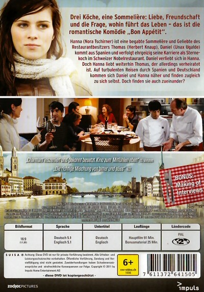 Drei Köche, eine Sommelière: Liebe, Freundschaft und die Frage, wohin das Leben führt – das sind die Zutaten für die herzerwärmende Romanze "Bon Appétit". Hanna ist eine begabte deutsche Sommelière und die Geliebte von ihrem Chef Thomas, dem Besitzer eines renommierten Zürcher Restaurants, der charmante junge Spanier Daniel verfolgt ehrgeizig seine Karriere als Sternekoch im Schweizer Nobelrestaurant. Beide sind eng mit dem attraktiven italienischen Koch Hugo befreundet. Er ist Thomas‘ rechte Hand und so auch Daniels Rivale. Daniel verliebt sich in Hanna. Doch Hanna, die einst mit Hugo zusammen war, liebt nun Thomas, der allerdings verheiratet ist. Auf turbulenten Reisen durch Spanien und Deutschland kommen sich Daniel und Hanna näher und finden zugleich zu sich selbst. Doch finden sie auch zueinander?