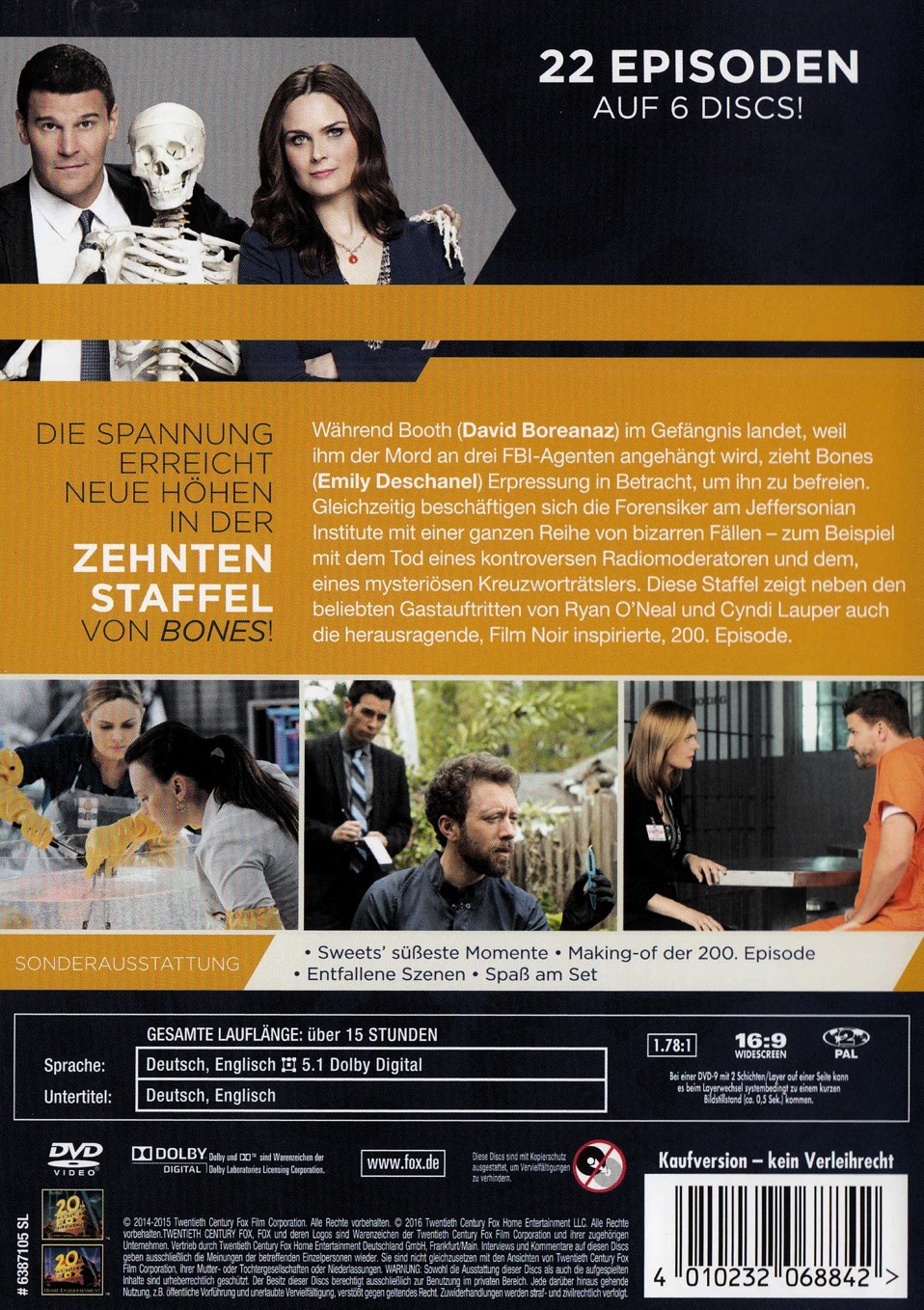 In der zehnten Staffel geht es wieder spannend zu: Während Booth im Gefängnis landet, weil ihm der Mord an drei FBI-Agenten angehängt wird, zieht Bones Erpressung in Betracht, um ihn zu befreien. Gleichzeitig beschäftigen sich die Forensiker am Jeffersonian Institute mit einer ganzen Reihe von bizarren Fällen - zum Beispiel mit dem Tod eines kontroversen Radiomoderators und dem, eines mysteriösen Kreuzworträtslers.
