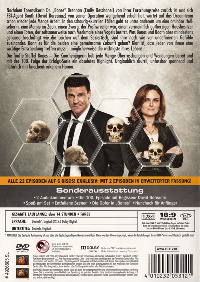 Die fünfte Staffel "Bones - Die Knochenjägerin" hält jede Menge Überraschungen und Wendungen bereit und mit der 100. Folge der Erfolgs-Serie ein absolutes Highlight. Unglaublich skurril, unfassbar spannend und natürlich mit knochentrockenem Humor.