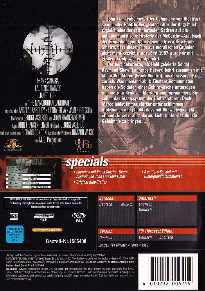 John Frankenheimers (Der Gefangene von Alcatraz) spannender Politthriller „Botschafter der Angst“ist zugleich eine der raffiniertesten Satiren auf die antikommunistische Hysterie der McCarthy-Ära. Nach der Ermordung von John F. Kennedy erwirkte Frank Sinatra, dass dieser Film aus moralischen Gründen nicht mehr gezeigt wurde. Erst 1987 wurde er mit grossem Erfolg wiederaufgeführt.