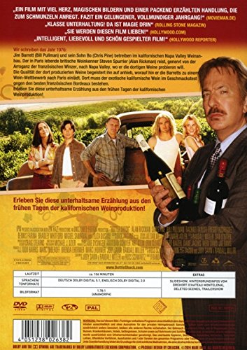 INHALT: Wir schreiben das Jahr 1976: Jim Barrett (Bill Pullman) und sein Sohn Bo (Chris Pine) betreiben im kalifornischen Napa Valley Weinanbau. Der in Paris lebende britische Weinkenner Steven Spurrier (Alan Rickman) reist, genervt von der Arroganz der französischen Winzer, nach Napa Valley, wo er die dortigen Weine probieren will. Die Qualität der dort produzierten Weine begeistert ihn auf anhieb, worauf hin er die Barretts zu einem Wein-Wettbewerb nach Paris einlädt. Dort muss der exotische kalifornische Wein im Geschmackstest gegen den besten französischen Bordeaux bestehen. Erleben Sie diese unterhaltsame Erzählung aus den frühen Tagen der kalifornischen Weinproduktion!