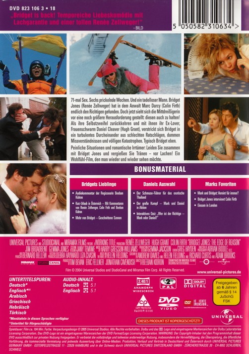 71 Mal Sex. 6 prickelnde Wochen. Und ein tadelloser Mann. Bridget Jones hat in dem Anwalt Marc Darcy endlich den Richtigen gefunden. Doch jetzt sieht sich die Mitdreiigerin vor eine noch grere Herausforderung gestellt diesen auch zu halten! Als ihre Selbstzweifel zurckkehren und mit ihnen ihr Exlover, Frauenschwarm Daniel Cleaver, verstrickt sich Bridget in ein turbulentes Durcheinander aus schlechten Ratschlgen, dummen Missverstndnissen und vlligen Katastrophen. Typisch Bridget, eben.