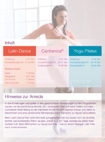 Das Programm besteht aus drei Top-Workouts, die sich perfekt ergänzen: -Fett verbrennen mit Latin Dance-Flacher Bauch mti Cantienica-Straffer Körper mit YogalatesDen Körper formen und straffen, Problemzonen effektiv remodellieren und die Fettverbrennung auf Touren bringen: So klappt es garantiert mit der Bikini-Figur für die Strandsaison 2012!
