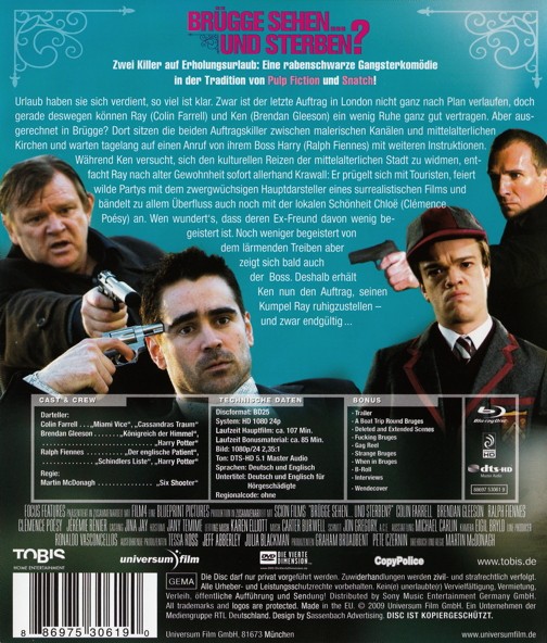 Dort sitzen die beiden Auftragskiller zwischen malerischen Kanälen und mittelalterlichen Kirchen und warten tagelang auf einen Anruf von ihrem Boss Harry (Ralph Fiennes) mit weiteren Instruktionen. Von gepflegter Langeweile kann allerdings keine Rede sein. Während Ken versucht, sich den kulturellen Reizen der mittelalterlichen Stadt zu widmen, entfacht Ray nach alter Gewohnheit sofort allerhand Krawall: Er prügelt sich mit Touristen, feiert wilde Partys mit dem zwergwüchsigen Hauptdarsteller eines surrealistischen Films und bändelt zu allem Überfluss auch noch mit der lokalen Schönheit Chloë (Clémence Poésy) an. Wen wundert’s, dass deren Ex-Freund davon wenig begeistert ist. Noch weniger begeistert von dem lärmenden Treiben aber zeigt sich bald auch der Boss. Deshalb erhält Ken nun den Auftrag, seinen Kumpel Ray ruhig zu stellen – und zwar endgültig...