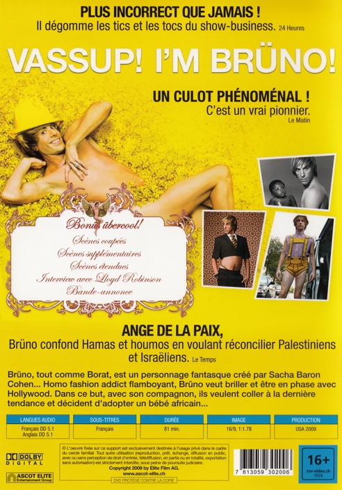 Brüno, tout comme Borat, est un personnage fantasque créé par Sacha Baron Cohen... Homo fashion addict flamboyant, Brüno veut briller et être en phase avec Hollywood. Dans ce but, avec son compagnon, ils veulet coller à la dernière tendance et décident d'adopter un bébé africain...