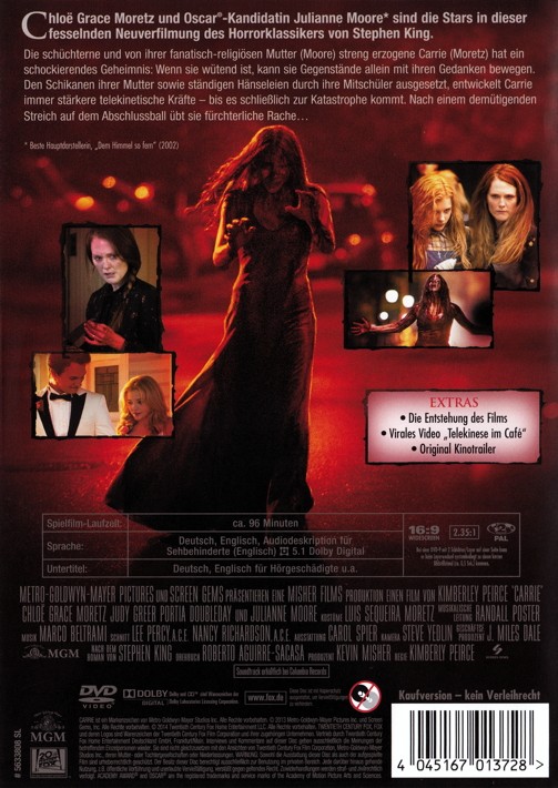 Freude kennt die schüchterne Carrie kaum. In der Highschool hänseln und mobben ihre Mitschüler sie auf übelste Weise, zuhause macht die fanatisch-religiöse Mutter dem Teenager das Leben zur Hölle. Carrie entwickelt telekinetische Kräfte, die immer stärker werden, je mehr Demütigungen sie erdulden muss. Als sie auf dem Abschlussball Opfer einer besonders schlimmen Attacke wird, endet das Fest in einer Katastrophe...