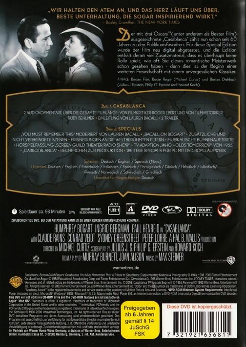 Die Zeit: Der zweite Weltkrieg. Der Ort: Marokko. Der Film: CASABLANCA, 'der beste Hollywood-Film aller Zeiten' (Leonard Maltin). In dem 45. Film seiner bedeutenden Karriere spielt Humphrey Bogart zum ersten mal einen romantischen Helden, der seine grosse Liebe in den Wirren des Krieges wieder findet. Bogart, der coole Nachtclubbesitzer Rick, würde seinen Kopf für niemanden hinhalten. Die bezaubernde Ingrid Bergman spielt Ilsa, Ricks grosse Liebe, die ihren Ehemann und Resistance-Kämpfer aus Casablanca bringen muss. Nur Rick kann die beiden retten...