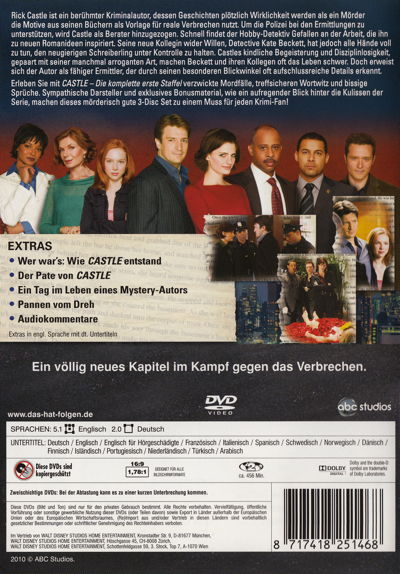Erleben Sie mit Castle - Die komplette erste Staffel verzwickte Mordfälle, treffsicheren Wortwitz und bissige Sprüche. Sympathische Darsteller und exklusives Bonusmaterial, wie ein aufregender Blick hinter die Kulissen der Serie, machen dieses mörderisch gute 3-Disc Set zu einem Muss für jeden Krimi-Fan.