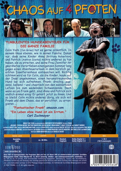 Colin York hat es gerne ordentlich. In seinem Haus ebenso, wie in seiner Familie. Dumm nur, dass seine Kinder Anna und Patrick nichts anderes zu tun haben, als zu streiten und seine Frau ihr geordnetes Vorortleben einen ganzen Sommer lang gegen einen Abenteuerurlaub in dem kürzlich geerbten Inselferienhaus eintauschen will. Richtig schlimm wird es für Colin, als die Kinder, kaum auf der Insel angekommen, einen herumstreunenden Hund bei sich aufnehmen, Frank! Dreckig, pupsend, bellend - und chaotisch von den sabbernden Lefzen bis zum wedelnden Schwanzende. Doch wenn es um Frank geht, sind Anna und Patrick sich endlich einmal einig. Er gehört jetzt zu ihnen. Und so bleibt Colin nichts anderes übrig, als sich mit Frank und dem Chaos, das er anrichtet, zu arrangieren.